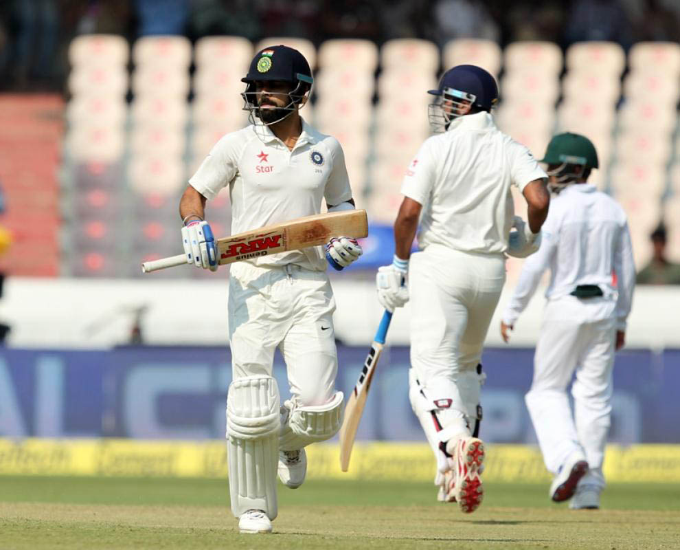 India 1st innings: 356 for 3 in 90 overs(Virat Kohli 111 not out, Murali Vijay 108, Cheteshwar Pujara 83; Taijul Islam 1/50, Taskin Ahmed 1/58). (AGENCIES)