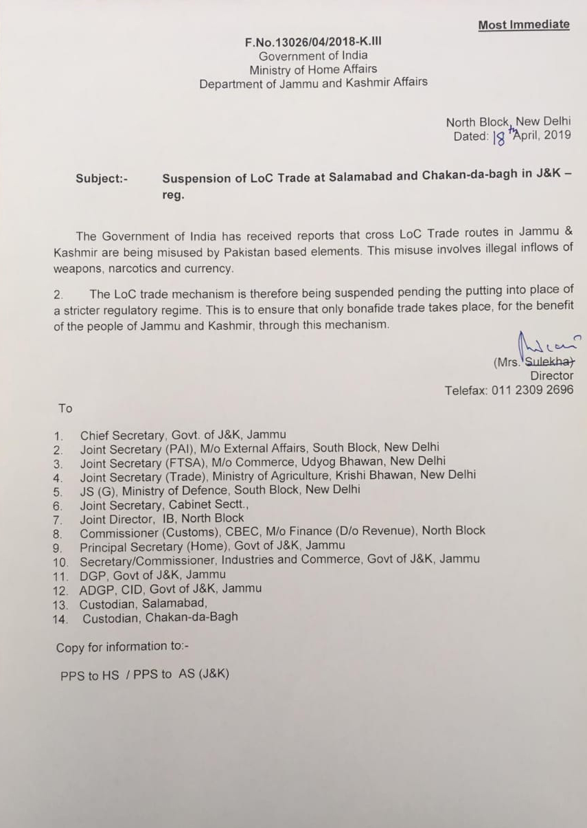 India suspends Cross-LoC trade By Daily Excelsior - April 18, 2019 Share FacebookTwitterWhatsAppPinterestLinkedinCopy URLTelegramEmailTumblrReddItPrintKoo Follow our WhatsApp channel