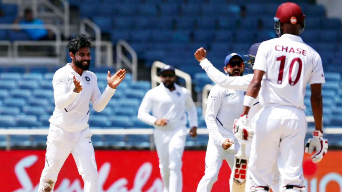 Indian players celebrating dismissal of West Indies batsman Roston Chase during 2nd Test at Kingston.