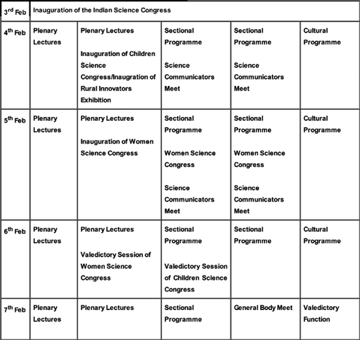 The five-day Congress shall provide a platform for intense discussion on the recent developments in the field of Science & Technology in the country and abroad. Main theme of this year’s Science Congress is “Innovations in Science and Technology for Inclusive Development”.