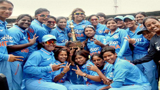 Indian women's cricket team celebrate with trophy as they won ODI series against New Zealand by 3-2 at Chinnaswamy stadium in Bangalore.