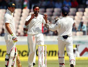 India’s R Ashwin celebrating after taking Glenn Maxwell wicket during 2nd Test Match against Australia at Hyderabad.