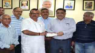 Industries Minister Chander Parkash Ganga giving cheque to Tehsildar at Bari Brahmna on Friday.