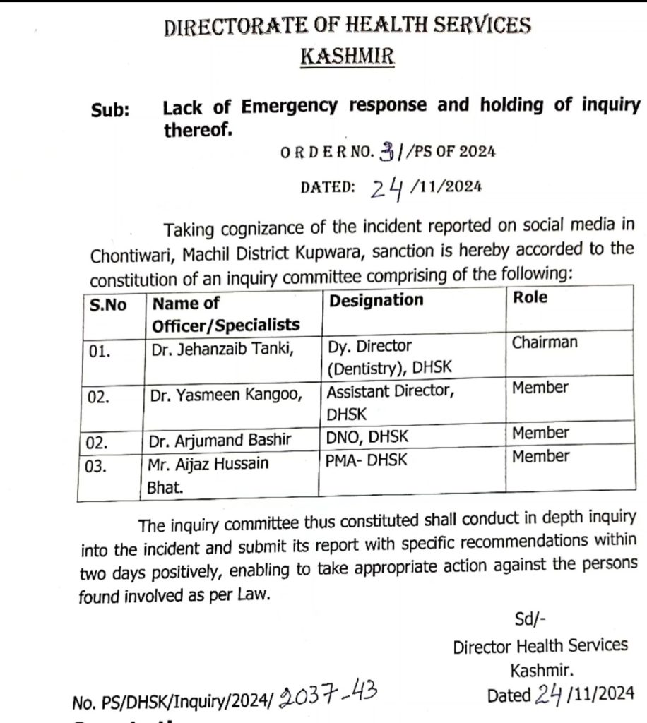 KUPWARA, Nov 24: The Directorate of Health Services Kashmir (DHSK) has taken serious note of an alleged emergency response failure in Chontiwari, Madill district, Kupwara and an inquiry has been ordered to investigate the incident.