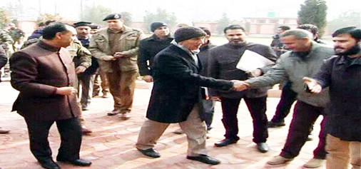 Interlocutor Dineshwar Sharma meeting delegations in Baramulla on Tuesday.-Excelsior/Aabid Nabi
