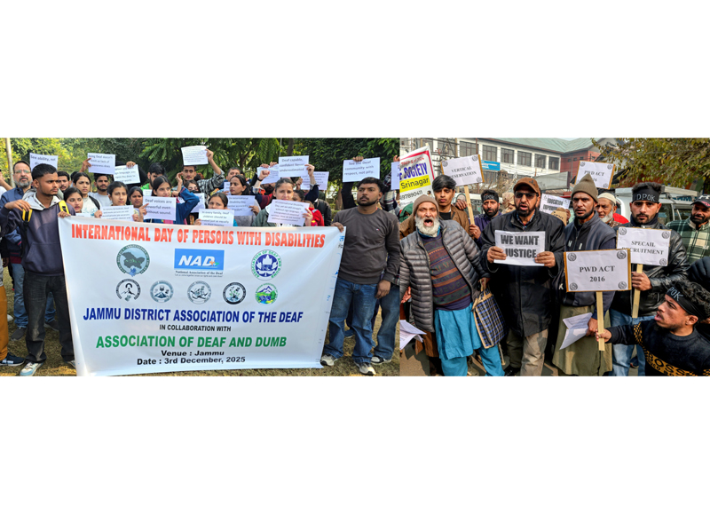 JAMMU, Dec 3: On International Day of Persons with Disabilities (PwDs), protest demonstrations were held by the PwDs in both the capital cities of Jammu and Srinagar seeking special concessions, increased pension and jobs for them.