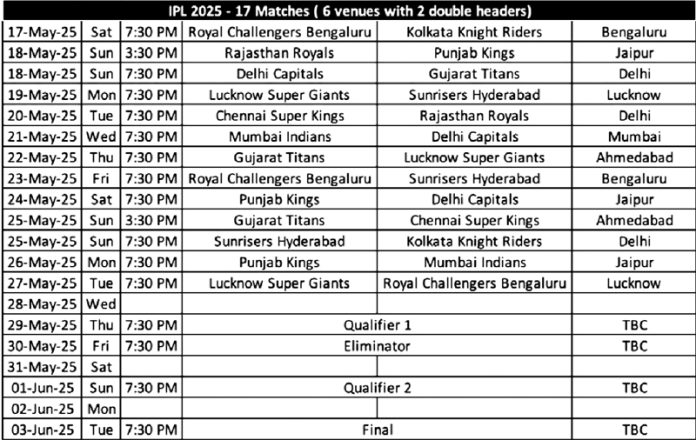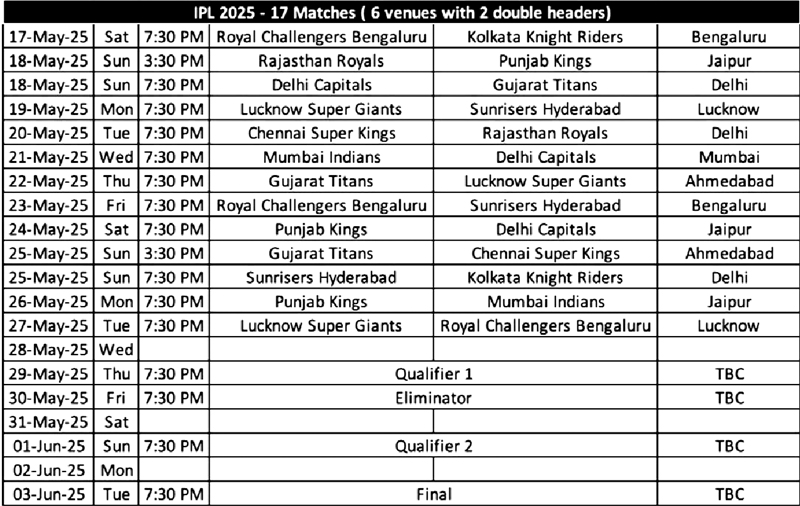 The first match upon the resumption of the league will be between Royal Challengers Bengaluru and Kolkata Knight Riders in Bengaluru on May 17.