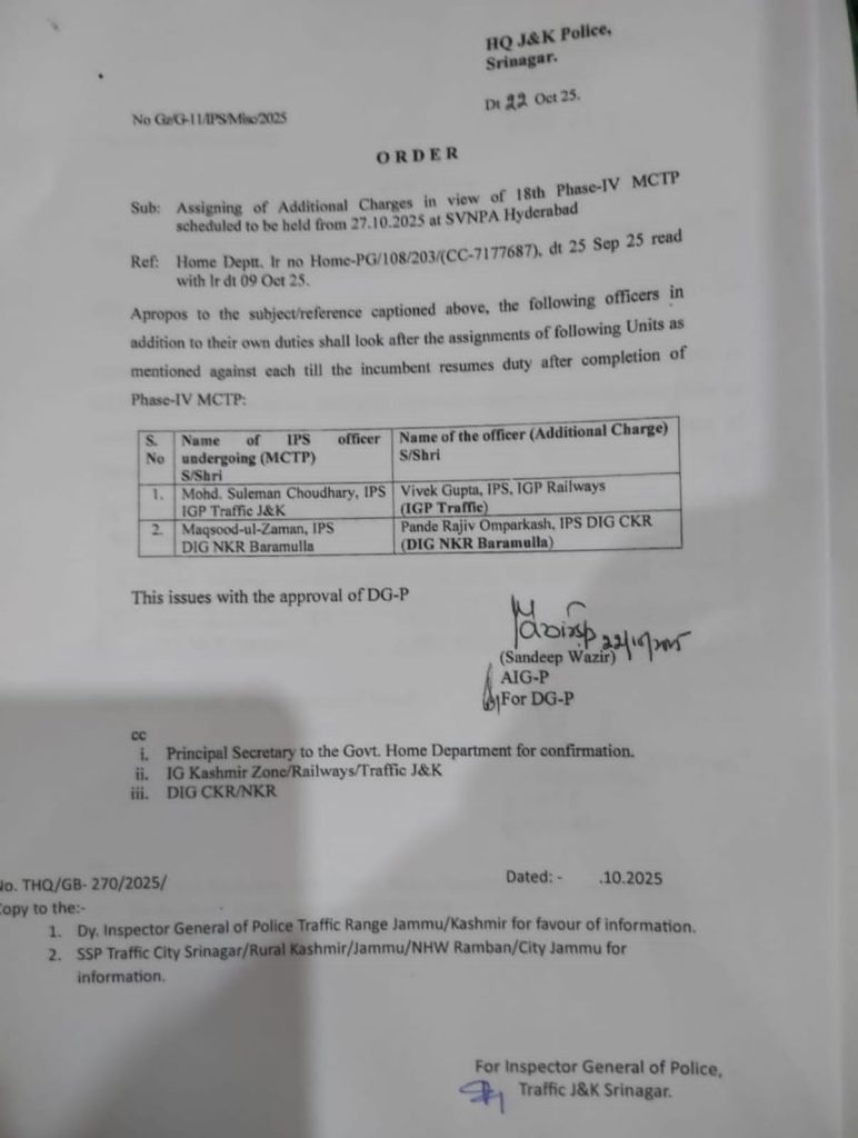 Srinagar, Oct 23: Ahead of the 18th Phase-IV Mid-Career Training Programme (MCTP) scheduled from October 27, 2025, at the Sardar Vallabhbhai National Police Academy (SVNPA), Hyderabad, the Jammu and Kashmir Home Department has assigned additional charges to senior IPS officers to ensure smooth functioning during the period of their absence.