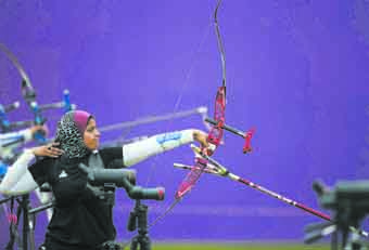 Iraq’s Rand Al-Mashhadani watches her shot during the women’s archery individual ranking round of the London 2012 Olympics Games at the Lords Cricket Ground in London on Friday.(UNI)