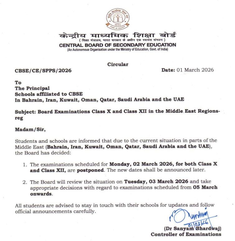 “Students and schools are informed that due to the current situation in parts of the Middle East (Bahrain, Iran, Kuwait, Oman, Qatar, Saudi Arabia and the UAE), the Board has decided to postpone the Class X and Class XII examinations scheduled to be held on Monday, March 02, 2026, in the Middle East region,” said the Central board in a statement.