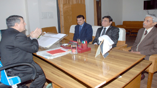 IT Commissioner, AK Thatai in a meeting with Chief Information Commissioner, G R Sufi at Jammu on Friday.