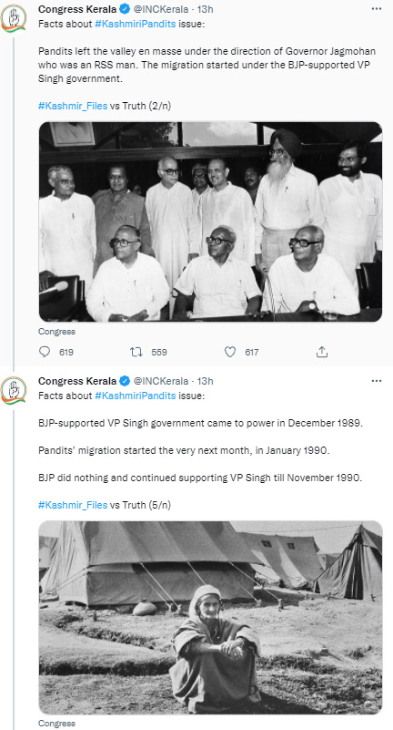 The Kerala Congress also sought to shift the onus for the exodus to the BJP, saying “the migration suited the agenda of the BJP for the Hindu-Muslim division while carrying out the Ram Mandir issue in Ayodhya”. Another tweet claimed that the then Jammu and Kashmir Governor Jagmohan was an RSS man, and he in place of providing security to the Pandits asked them to leave the valley en masse.