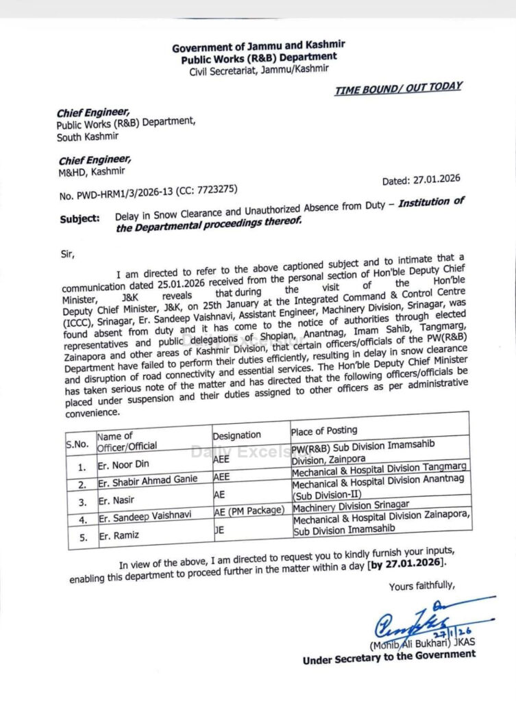 The complaints cited failure in timely snow clearance, leading to disruption of road connectivity and essential services. Taking serious note of the matter, the Deputy Chief Minister has directed that the following officers and officials be placed under suspension and their duties reassigned as per administrative convenience, Er. Noor Din, AEE, PW(R&B) Sub Division Imam Sahib, Division Zainapora.