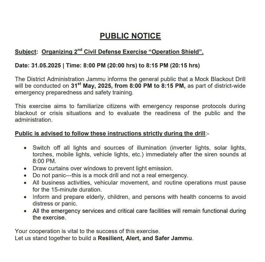 JAMMU, May 30: The Jammu District administration has issued guidelines for the second mock drill, codenamed “Operational Shield” and sought cooperation from the general public in making the exercise successful.