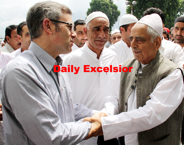 Jammu and Kashmir Chief Minister Mufti Mohammad sayed and Former Chief Minister and National Conference working president Omar Abdullah greets each other after perform Eid Al-Fitr prayers at Hazratbal shrine in Srinagar, on Saturday. …. Excelsior/Mohd Amin War