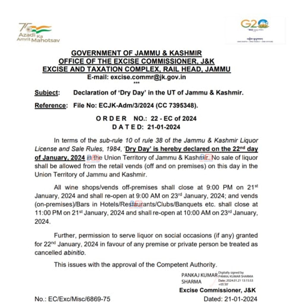 Jammu And Kashmir Declares Dry Day On January 22 By Daily Excelsior - January 21, 2024 Share FacebookTwitterWhatsAppPinterestLinkedinCopy URLTelegramEmailTumblrReddItPrintKoo JAMM, Jan 21: As the country gears up to witness the grand ‘Pran Pratistha’ ceremony at Ayodhya’s Ram temple, the J&K government has decided to observe a ‘dry day’ on January 22 to mark the auspicious day. Follow our WhatsApp channel
