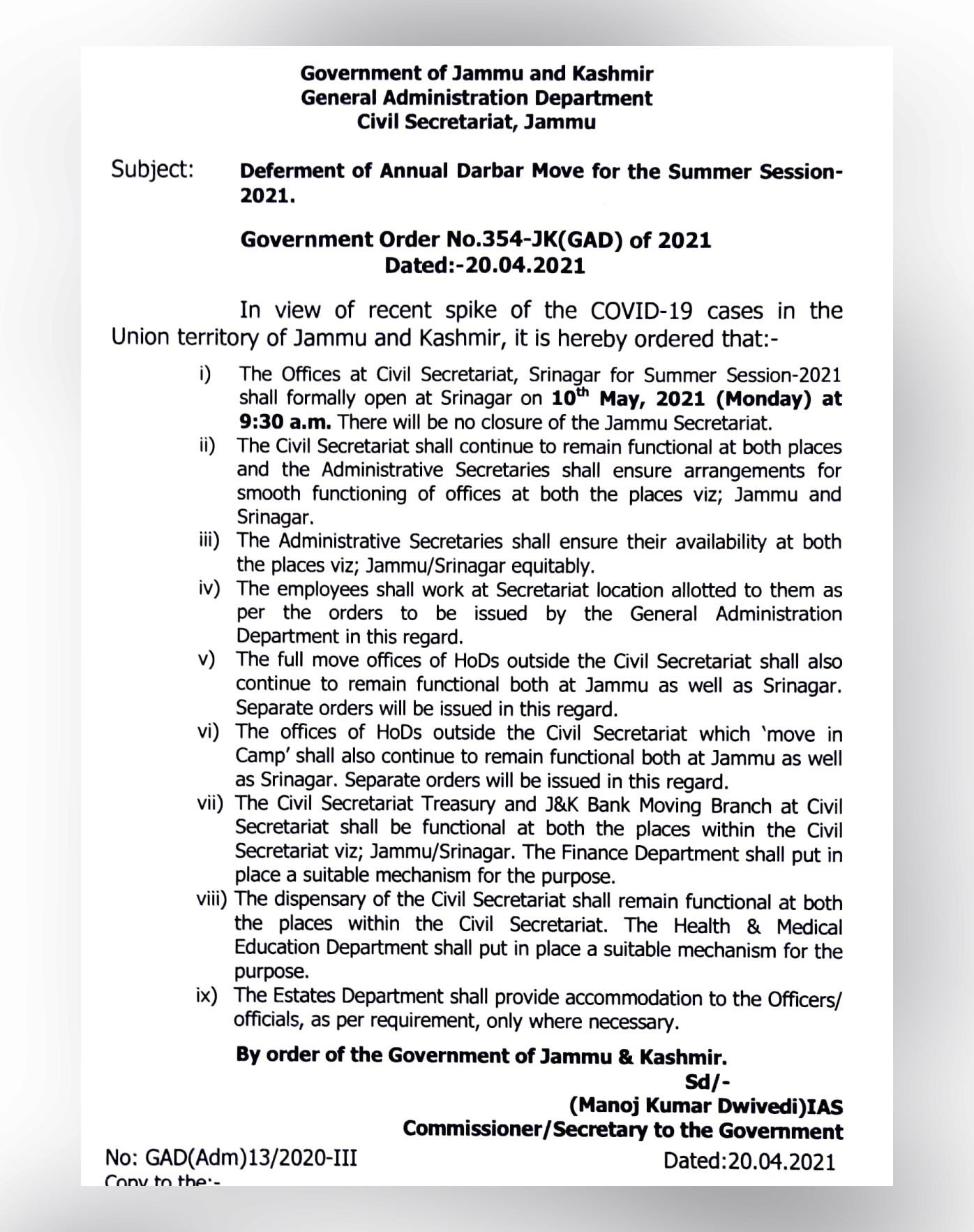 Jammu and Kashmir Govt deferred Annual Darbar Move for Summer Session-2021 By Daily Excelsior - April 20, 2021 Share FacebookTwitterWhatsAppPinterestLinkedinCopy URLTelegramEmailTumblrReddItPrintKoo File Photo Jammu and Kashmir Govt deferred Annual Darbar Move for Summer Session-2021 Follow our WhatsApp channel