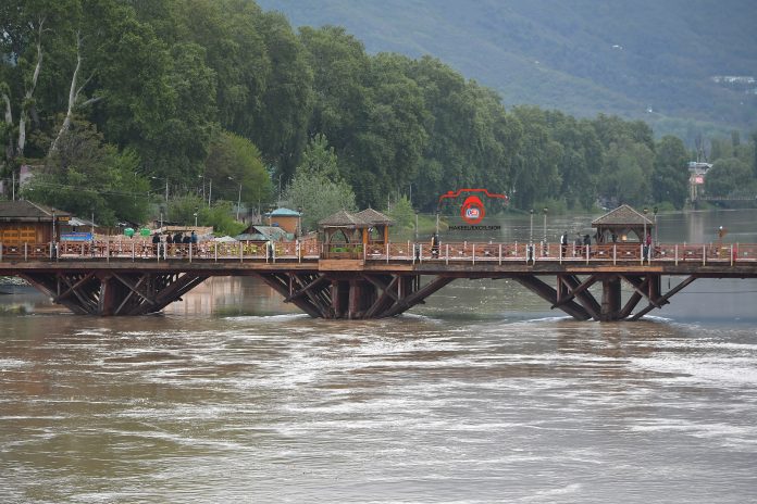 Srinagar, Apr 30: Even as rain has stopped in Kashmir, the water level in the Jhelum crossed the “flood declaration” mark in Srinagar on Tuesday morning.