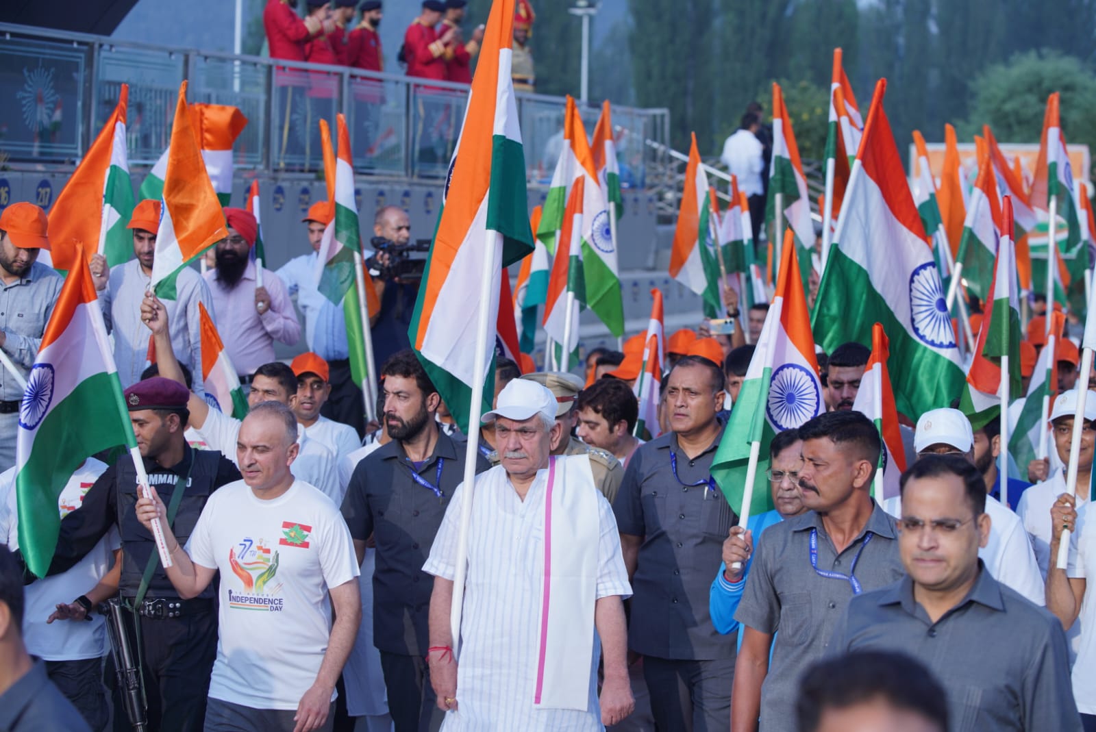 Srinagar, Aug 13: Lieutenant Governor Manoj Sinha today flagged-off the Tiranga Yatra in Srinagar and joined thousands of enthusiastic citizens in the walkathon from KICC to Botanical Garden.