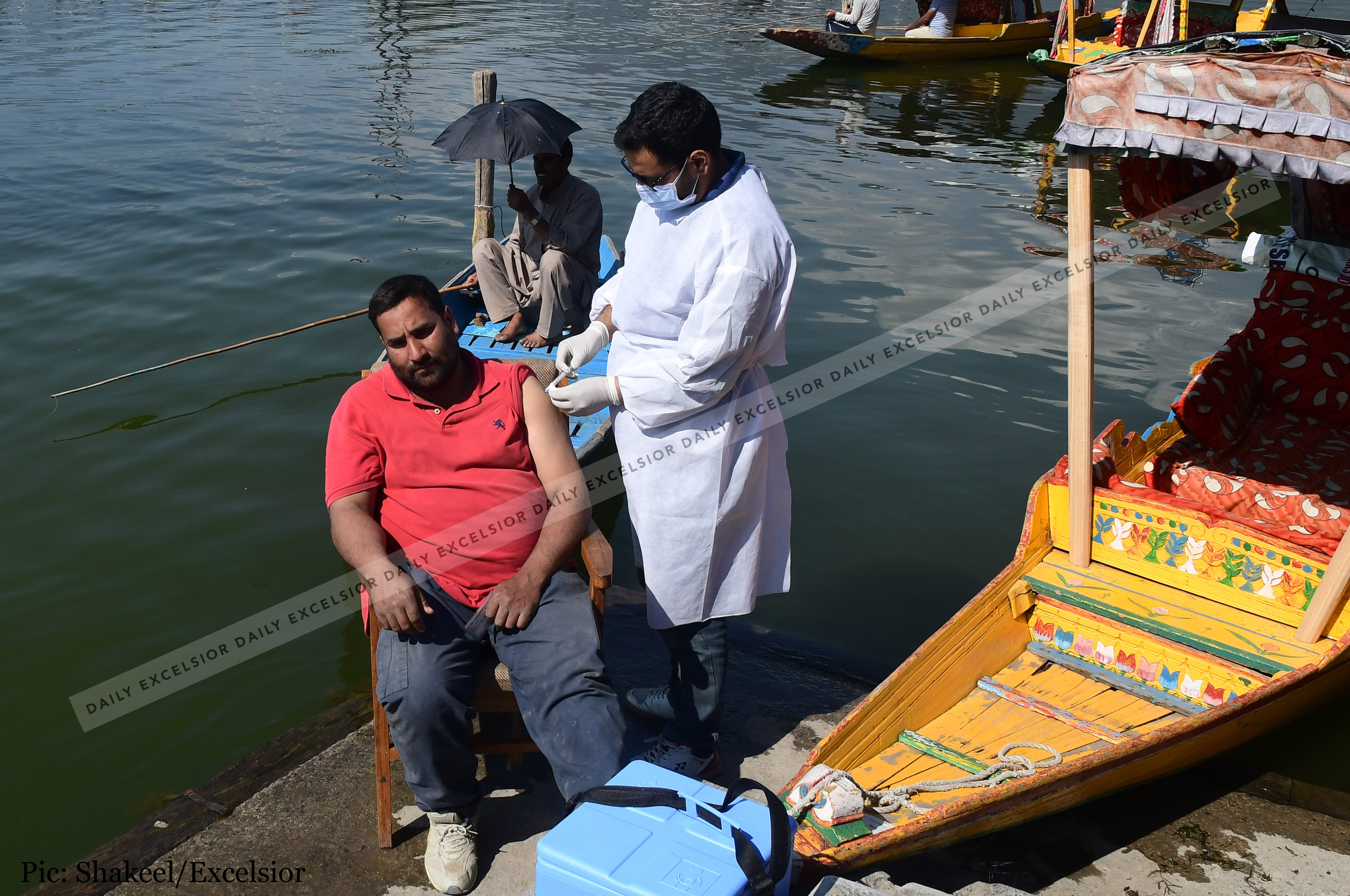A health worker vaccinates a Shikara man with Covishield vaccine in Dal Lake Srinagar