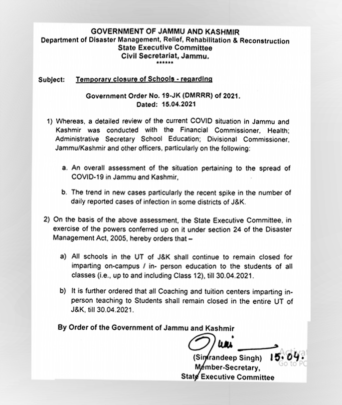 “All schools in J&K shall continue to remain closed for imparting on-campus/in-person education to the students of all classes (i.e., up to and including Class 12), till 30.04.2021,” reads an order issued by Simrandeep Singh, member Secretary State executive Committee.