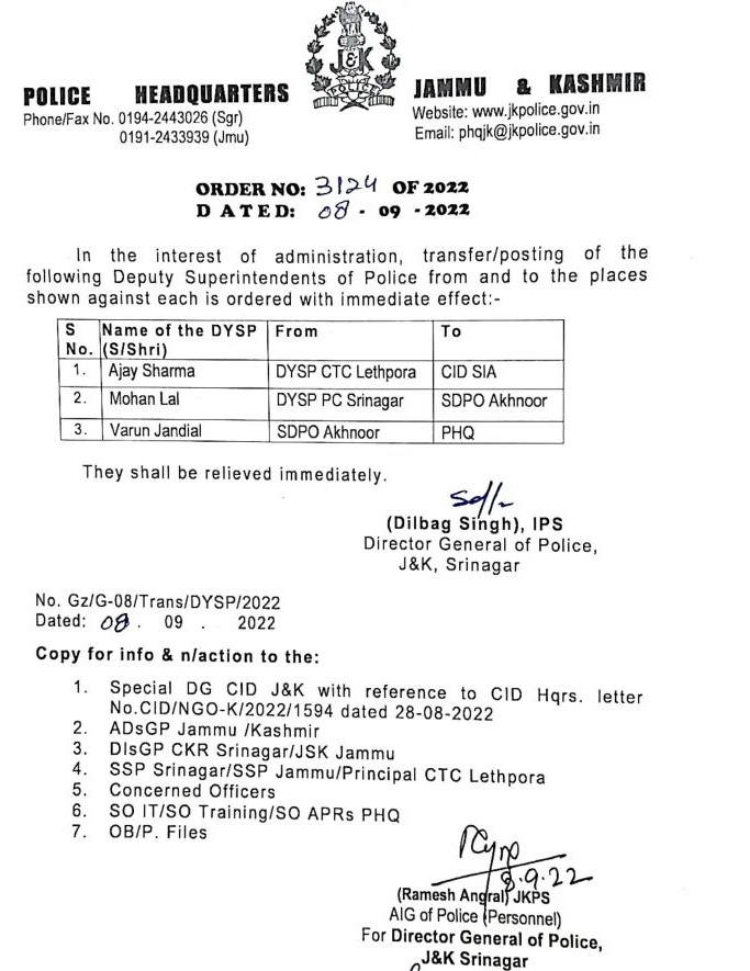 According to the order, Ajay Sharma, DySP CTC Lethpora has been transferred and posted to CID SIA, Mohan Lal from DySP PC Srinagar to SDPO Akhnoor and Varun Jandial from SDPO Akhnoor to PHQ.