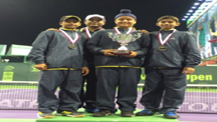 Sumit Pal Singh holding trophy alongwith other participants of Indian Junior Tennis team at Qatar.