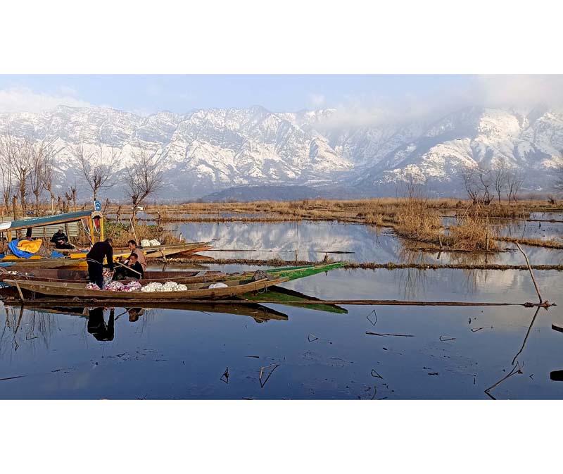 Amid sunshine with snow covered mountains in the background, Shikaras ready to move towards the other side of Dal lake on Tuesday. -Excelsior/Shakeel