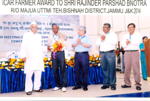 JAMMU June 23: Rajinder Parshad Banotra, a progressive farmer of village Majua Uttami (Bishnah), Jammu has been conferred with Kissan Samman-2014 for his outstanding services in the field of agriculture at recently concluded 23rd Regional Council meeting of Indian Council of Agriculture Research (ICAR) at Dehradun, Uttrakhand. The award was presented by Harish Chandra Durgapal, Minister for Labour & Industry, Utharakhand.
