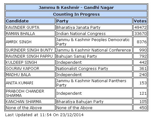 Jammu and Kashmir Election Results status of Gandhi Nagar By Daily Excelsior - December 23, 2014 Share FacebookTwitterWhatsAppPinterestLinkedinCopy URLTelegramEmailTumblrReddItPrintKoo Jammu and Kashmir Election Results status of Gandhi Nagar Follow our WhatsApp channel