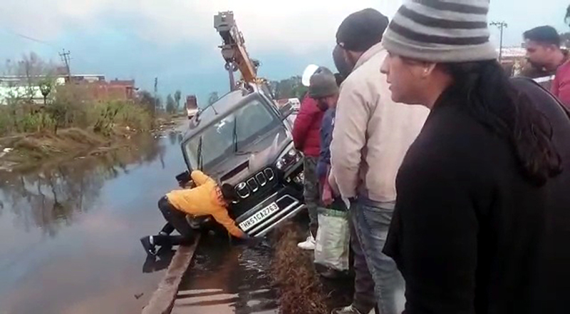 After passing the Toll Plaza at Lakhanpur the vehicle reached at Hatli Morh where it fell into open sewerage drain which was full of water and not to be visible. The vehicle was trapped in drain. Fortunately the family travelling in it had a narrow escape. But the vehicle was damaged and later it was lifted by a crane. The family members showed serious concern over the negligent attitude of NHAI and alleged that they have made the NH a death trap. The family alleged that the NHAI is only collecting the Toll Tax from vehicles just three kms away at Lakhanpur but they do not own the responsibility to maintain the road. A local person Rajesh Mehta alleged that the authority has failed to maintain the Highway at Lakhanpur which has tuned into a Khud. The LG Government need to impose heavy fine on National Highway Authority and order to maintain the Highway immediately.