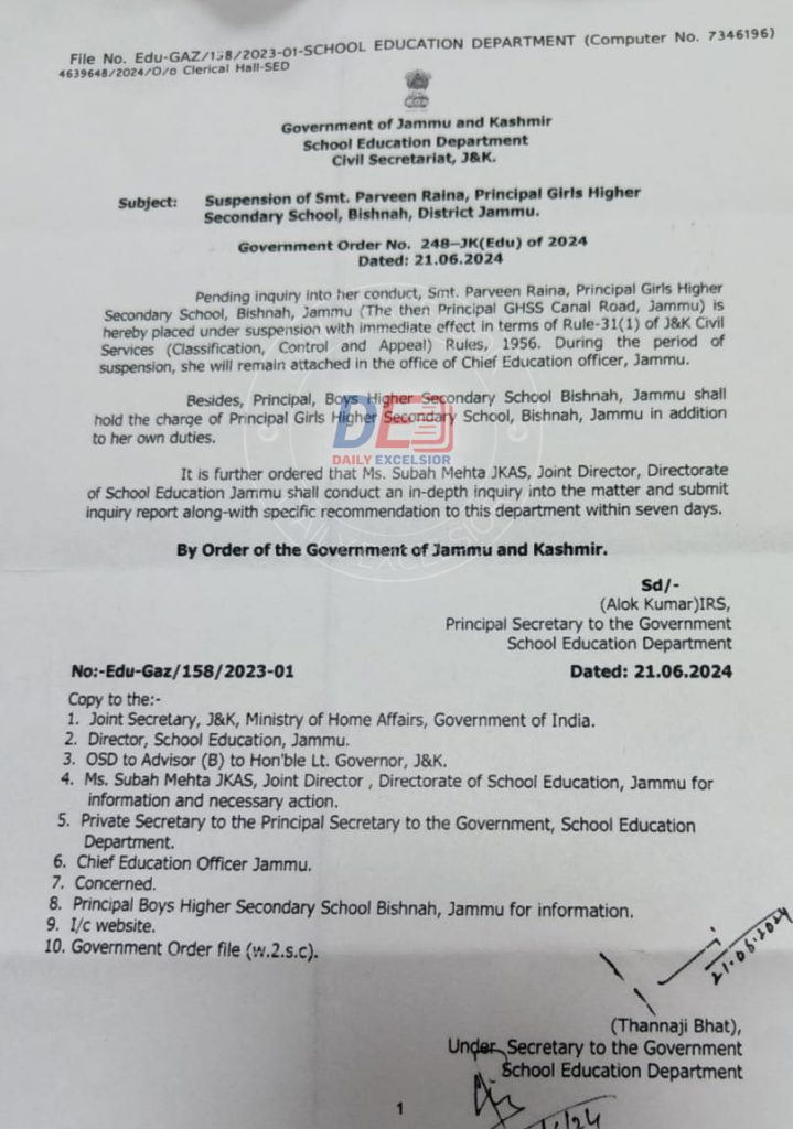 Jammu | Principal GHSS Bishnah Suspended By Daily Excelsior - June 26, 2024 Share FacebookTwitterWhatsAppPinterestLinkedinCopy URLTelegramEmailTumblrReddItPrintKoo JAMMU, June 26: Pending inquiry into her conduct, the School Education Department (SED) has ordered the suspension of Parveen Raina, Principal Government Girls Higher Secondary School (GHSS) Bishnah. Follow our WhatsApp channel