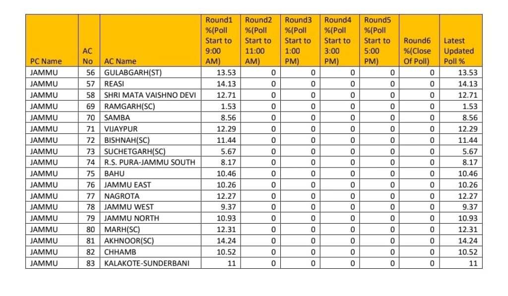 As per the updates issued by the election office, Gulabgarh (ST) has recorded 13.53% polling, Reasi 14.13%, Shri Mata Vaishno Devi 12.71%, Ramgrah (SC) 1.53%, Samba 8.56%, Vijaypur 12.29%, Bishnah (SC) 11.44%, Suchetgarh (SC) 5.67%, R S Pora-Jammu South 8.17%, Bahu 10.46%, Jammu East 10.26, Nagrota 12.27%, Jammu West 9.37%, Jammu North 10.93%, Marh (SC) 12.31%, Akhnoor (SC) 14.24%, Chhamb 10.52% and Kalakote has registered 11% till 9 am.