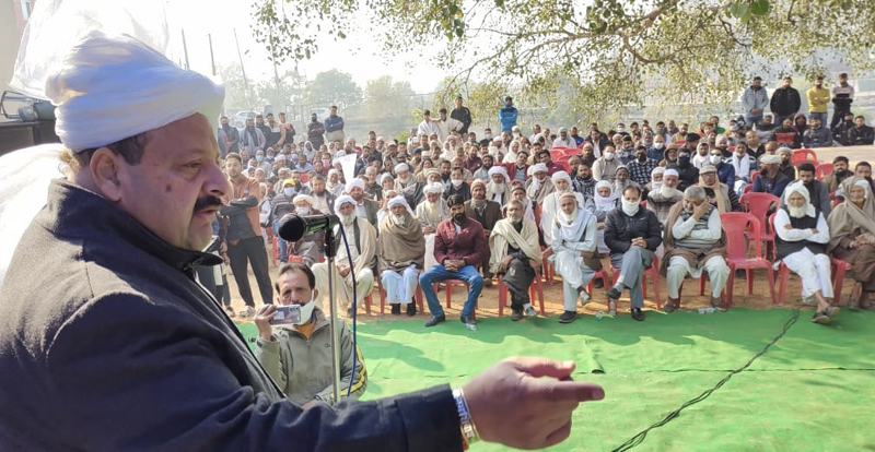BJP leader Devender Singh Rana addressing the gathering at Bathindi, Jammu on Saturday.