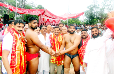 In all 59 bouts were played in the one day long Dangal. Mr Sharma gave Rs 9,000 as cash prize to the winner of 1st malli, Pahelwan Ishaq (Lalu), while Rs 6,000 was given to the runners-up Wrestler Gurpej by Sarpanch Romesh Chander and Naresh Kumar (Pappu Lakri).
