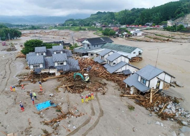 Raging rivers overflowing with water and mud have devastated swathes of Kyushu — the southernmost of Japan’s four main islands — after heavy rainfall, sweeping away roads and houses and destroying schools.