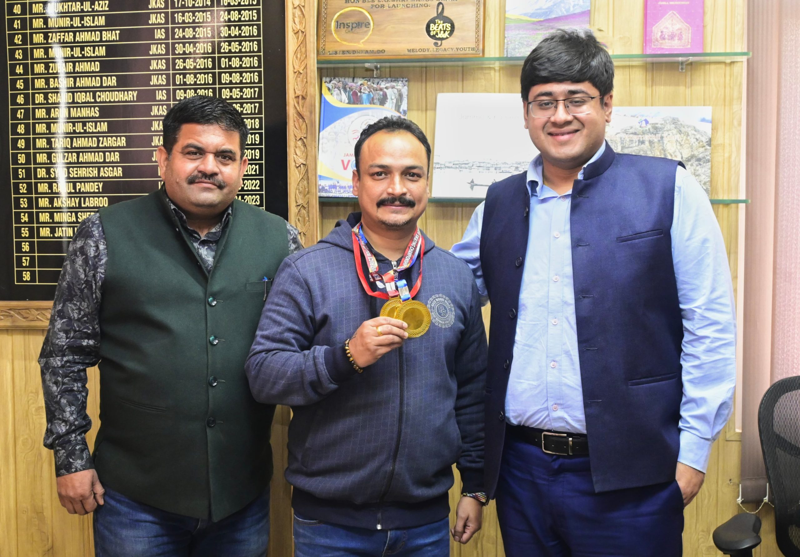 JAMMU, Nov 26: Director Information, Jatin Kishore, today congratulated Gagan Singh Jamwal, an employee of the Directorate of Information and Public Relations for clinching gold medal in District and J&K Roller Skates Hockey Championship and J&K Master Games Roller Hockey Championship recently held at Jammu.