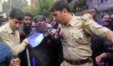 Police detaining Government employee leader Khurshad Alam Wani during a protest march in Srinagar on Wednesday.