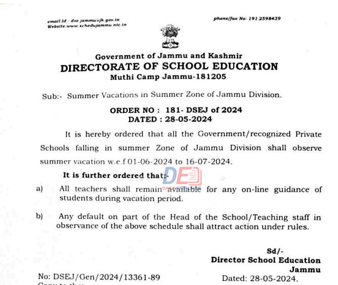 “It is hereby ordered that all the government and recognised private schools falling in the summer zone of the Jammu division shall observe summer vacation from June 1, 2024, to July 16, 2024,” the order stated.