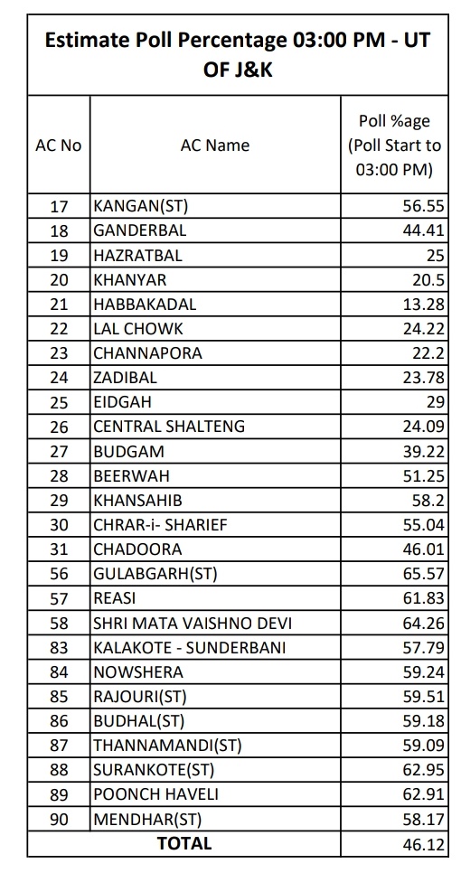 SRINAGAR, Sept 25: “Over 46.12 percent voter turnout has been recorded till 03:00 pm in all polling stations of 26 Assembly Constituencies of Jammu and Kashmir where polling is being held today under the 2nd phase of General Elections to the Legislative Assembly”, communicated the Chief Electoral Officer, J&K.