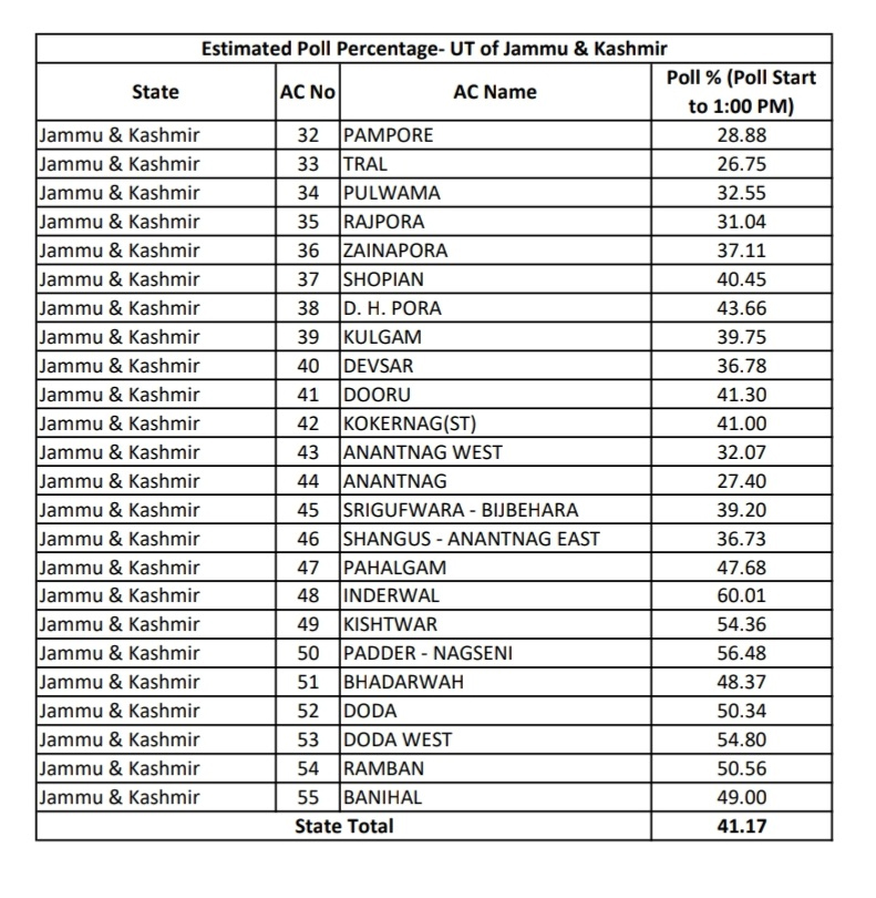 SRINAGAR, Sept 18: With polling for 1st Phase of General Elections to J&K Legislative Assembly receiving huge momentum, all polling stations of 24 Assembly Constituencies across seven districts of Jammu & Kashmir have recorded an impressive 41.17 percent voter turnout till 1 pm communicated the Chief Electoral Officer, J&K.