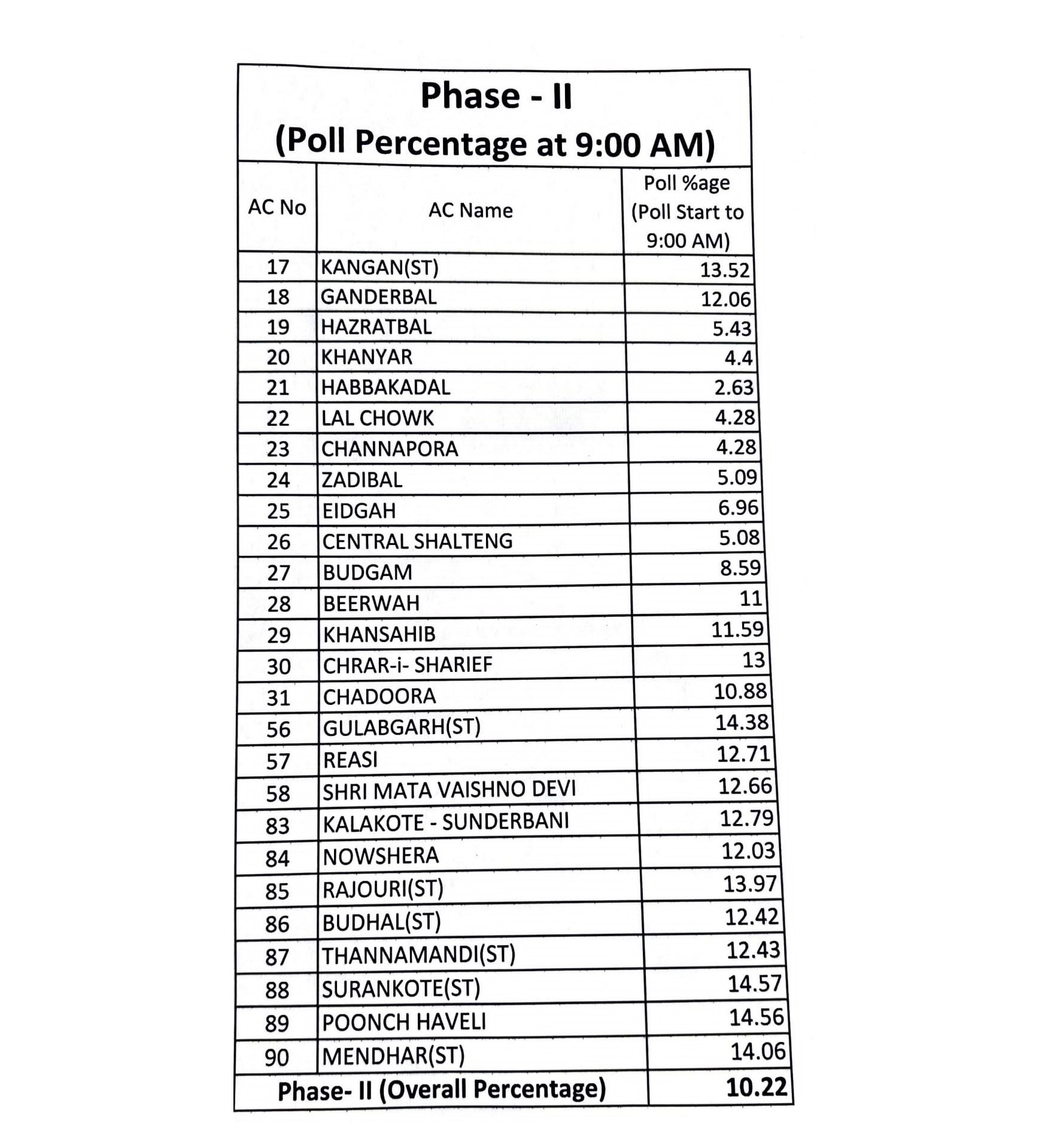 SRINAGAR, Sept 25: “The overall poll percentage of 10.22 was recorded upto 9:00 AM in all 26 assembly constituencies across six districts of J&K”, communicated the office of Chief Electoral Officer, J&K.