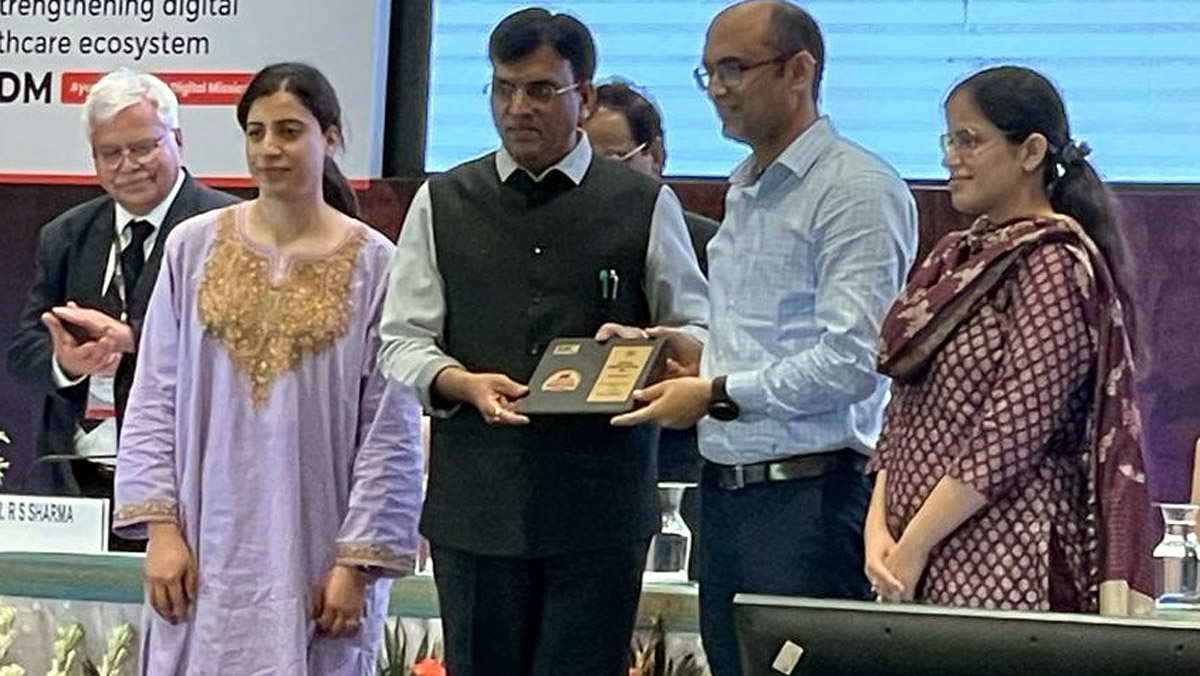 Dr Bhupinder Kumar; Chief Executive Officer, State Health Agency J&K, Ayushi Sudan and State Nodal Officer J&K, Sanam Mansoor received the award from Mandaviya at Vigyan Bhawan.