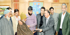 Today, Chairman and CEO of the Bank, Parvez Ahmad handed over the appointment letters and cash certificates worth Rs 10 lakh each to the bereaved families here at the Corporate Headquarters in presence of president, PK Tickoo, Zonal Head South Tasaduq Hussain, vice-president, M Ayoub Wanchoo, Cluster Head, Muzaffar Qadri and other bank officials. The amount has been contributed by the bank staff for the welfare of the two families.
