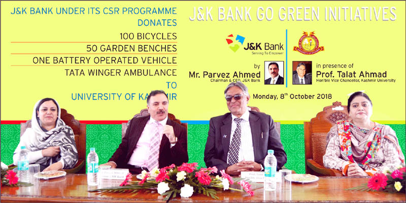 J&K Bank Chairman Parvez Ahmed, VC KU Professor Talat Ahmad and others during bank’s go green initiative at KU on Monday. By Daily Excelsior - October 8, 2018 Share FacebookTwitterWhatsAppPinterestLinkedinCopy URLTelegramEmailTumblrReddItPrintKoo J&K Bank Chairman Parvez Ahmed, VC KU Professor Talat Ahmad and others during bank's go green initiative at KU on Monday. J&K Bank Chairman Parvez Ahmed, VC KU Professor Talat Ahmad and others during bank’s go green initiative at KU on Monday. Follow our WhatsApp channel