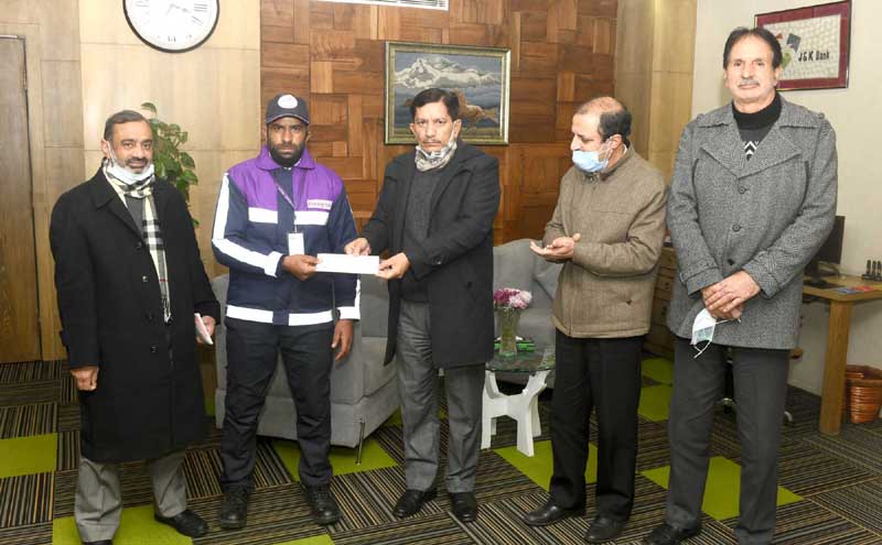 Srinagar, Dec 11: Jammu and Kashmir Bank Chairman and Managing Director R K Chhibber felicitated a security guard Nazir Ahmad Rather for successfully foiling an attempt of miscreants to loot the bank’s Auto-Teller Machine (ATM) at Pakherpora Budgam. The CMD presented a cash-reward and certificate-of-appreciation to the guard for the brave act in presence of Executive President G N Teeli and Zonal Head Kashmir Central II Syed Shujaat Hussain Andrabi at Bank’s corporate headquarters.