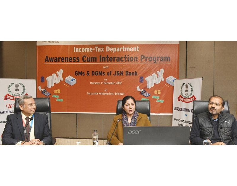 SRINAGAR, Dec 1: Income Tax Department today conducted an Awareness-Cum-Interaction Program on the Importance of Voluntary Compliance to Income Tax Act, 1961 here at J&K Bank’s Corporate Headquarters.