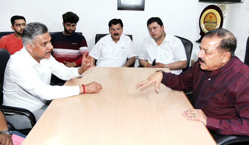 JAMMU, May 20: A delegation of PO aspirants of J&K Bank led by president Bar Association Jammu, and senior advocate Abhinav Sharma called on Union Minister, Dr Jitendra Singh here, today and demanded that they should be provided an opportunity to plead their case before the concerned authorities of J&K Bank as well as State Governor.