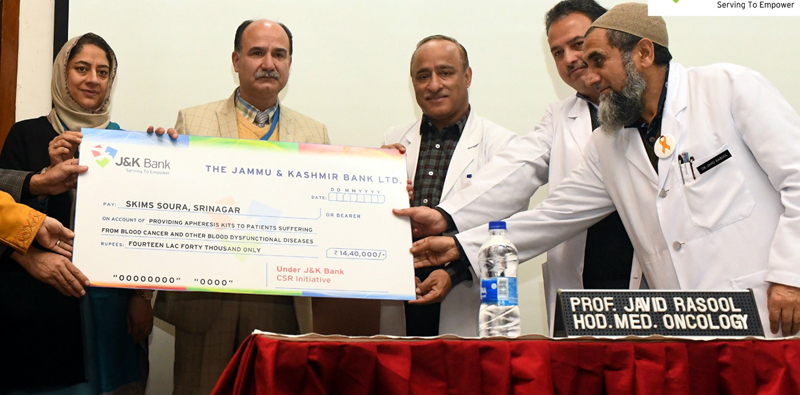 SRINAGAR, Feb 15: Under its Corporate Social Responsibility (CSR) Program, J&K Bank presented an amount of Rs 14.40 lakhs to the premier healthcare institution of Jammu and Kashmir for procurement of Platelet/Therapeutic Plasma Apheresis kits for treatment of poor patients suffering from cancer and severe blood dysfunctional diseases.