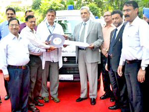 Chairman and CEO Mushtaq Ahmad today handed over the keys of the four emergency-vehicles to Principal, GMC Jammu Dr. Z H Gillani and one key to the Registrar, Jammu University Keshav Sharma at the bank’s Zonal Office Jammu. Medical Superintendent, MCH Dr. Rabinder Rattan Pal, Medical Superintendent, SSB Dr. Romesh Gupta, bank’s Executive presidents Vagish Chander, Abdul Rauf Bhat, vice presidents Arvind Gupta, Nishi Baru, Raman Kumar Kaushal and other officers of the respective institutions were present on the occasion.